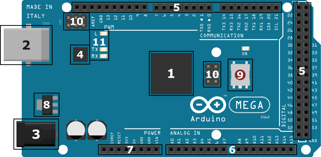- USB Connector – USB connector is used for two purposes in Arduino. The first one is to load the Mega 2560 user program to Arduino using Arduino IDE and another one is to power Arduino Board. Learn uploading program to Arduino board.