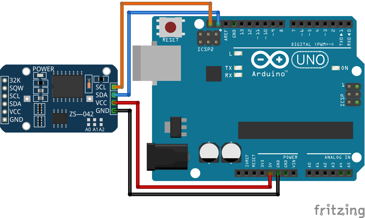 Make a circuit as per the given diagram. In the Real-Time Clock, there are six pins available. We will be using only four pins. Connect the pins as below given.