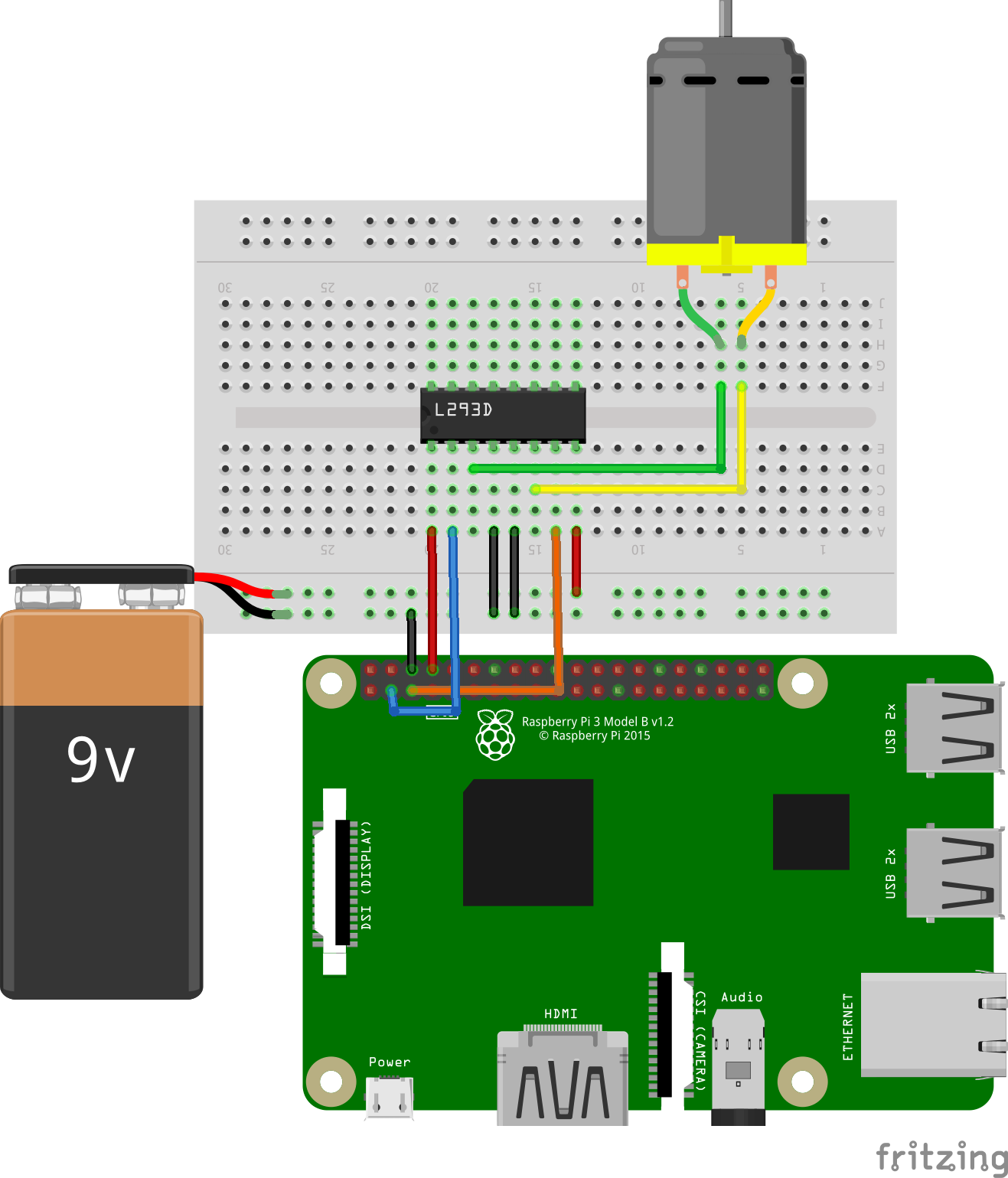 Make the circuit as per the given diagram. Connect motor input 1 to GPIO 3 and motor input 2 to GPIIO 5. Connect Enable pin to GPIO 8. The motor driver is provided an external 9V power supply using a 9V battery connected to the VSS pin. Connect GND pin to Raspberry Pi Ground.